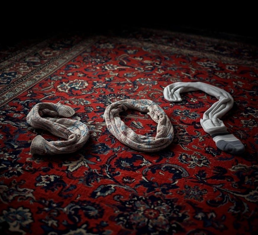 At home, I rehearse with my cats. I guide them past the dining room installation and say, this is titled Mail I Meant to Recycle in January, and then for the socks skillfully left in the same place for several months ago, I’d point out , they are part of an ongoing performance piece titled, Socks that spell out So? A tribute to laziness as poetry.